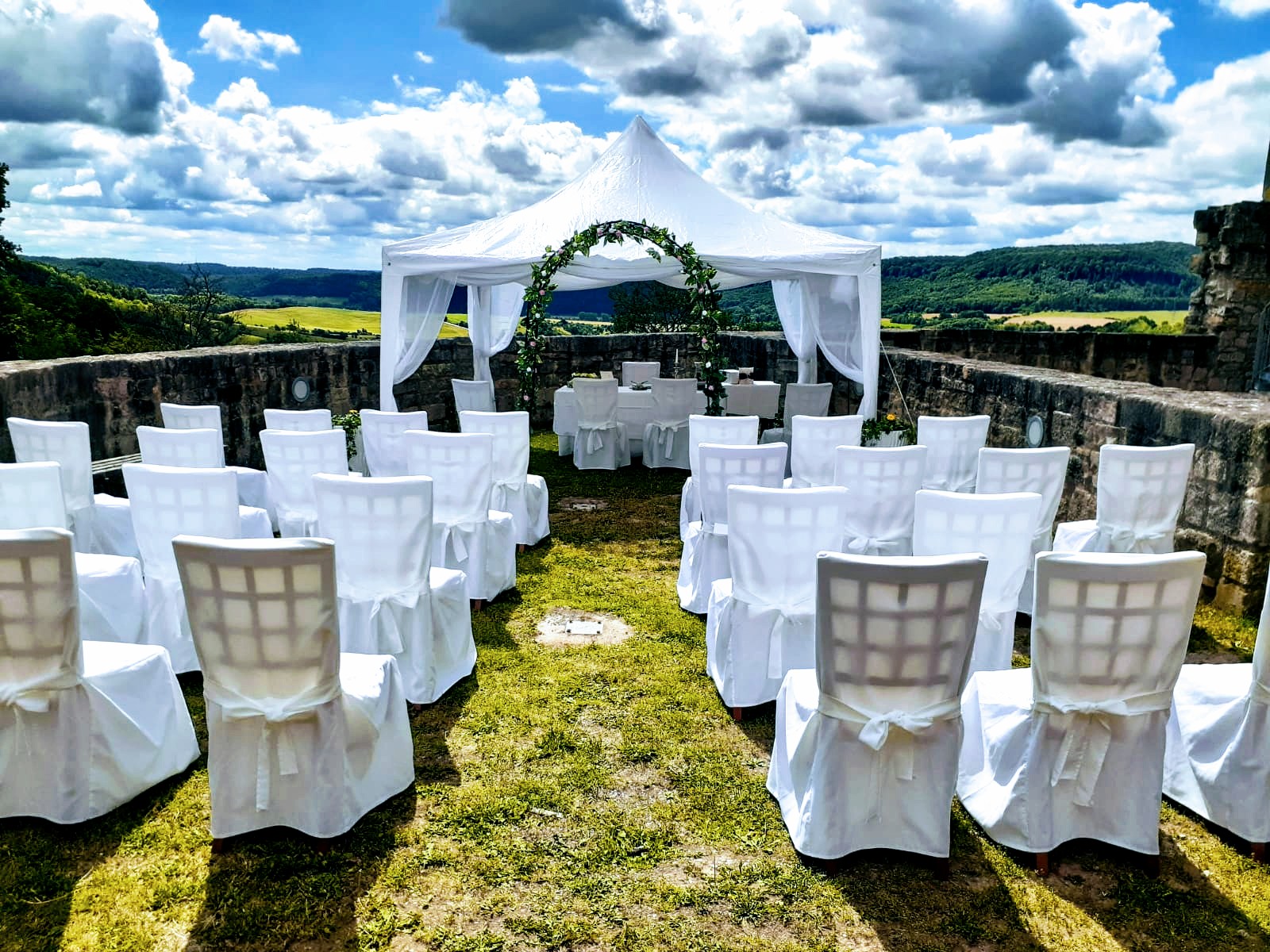 Geben Sie sich Ihr Ja- Wort unter freiem Himmel innerhalb der zeitgenössisch restaurierten Burganlage mit einzigartigem Panoramablick. Bitte beachten Sie: Außentrauungen sind außerhalb eines gültigen Pachtbetriebes nur unter gesondert zu vereinbarenden Bedingungen möglich. Hierbei ist zu beachten, dass als Schlechtwettervariante grundsätzlich das Kamin- oder Turmzimmer dazu gebucht werden muss. Der Burghof ist für Sie barrierefrei erreichbar.