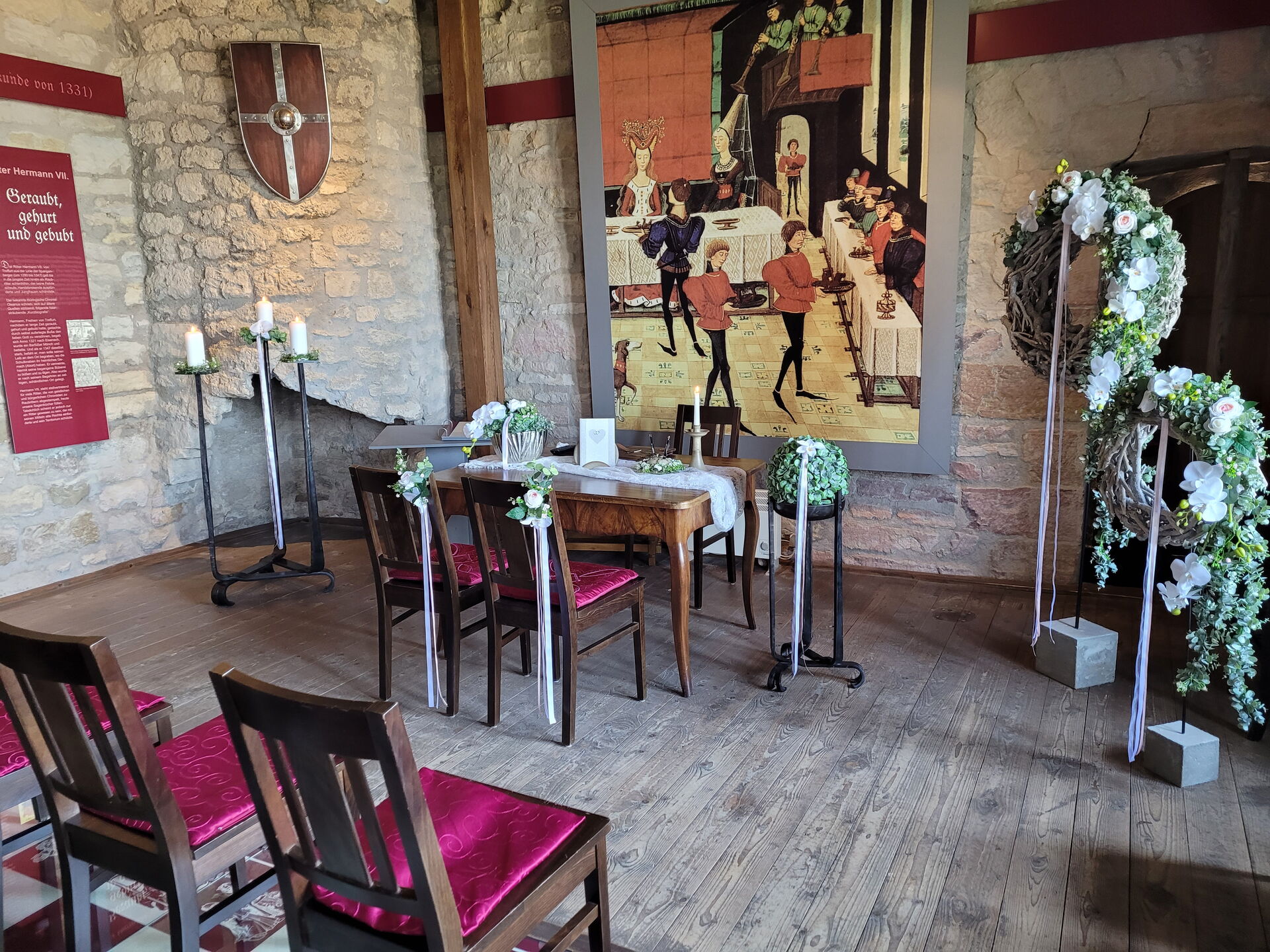 Das romantische Kaminzimmer befindet sich im Kapellenbau der gut erhaltenen und zeitgenössisch restaurierten Burganlage. Hier sind ganzjährig Trauungen mit bis zu 30 Personen möglich. Für eine höhere Personenzahl kann bei Bedarf auch der angrenzende Saal mitgenutzt werden.
