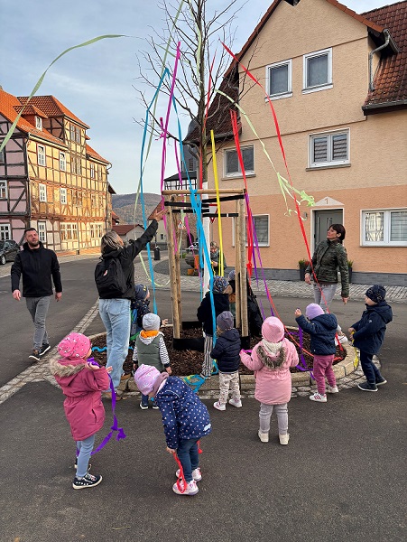 Ein besonderes Highlight war das Mitwirken der Kinder, die mit viel Freude bunte Bänder in die junge Baumkrone warfen. Ebenso bedanken wir uns bei den Erzieherinnen, die sich die Zeit nahmen und gemeinsam mit den Kindern einige Lieder sangen, wodurch die Übergabe einen feierlichen und fröhlichen Rahmen erhielt.
