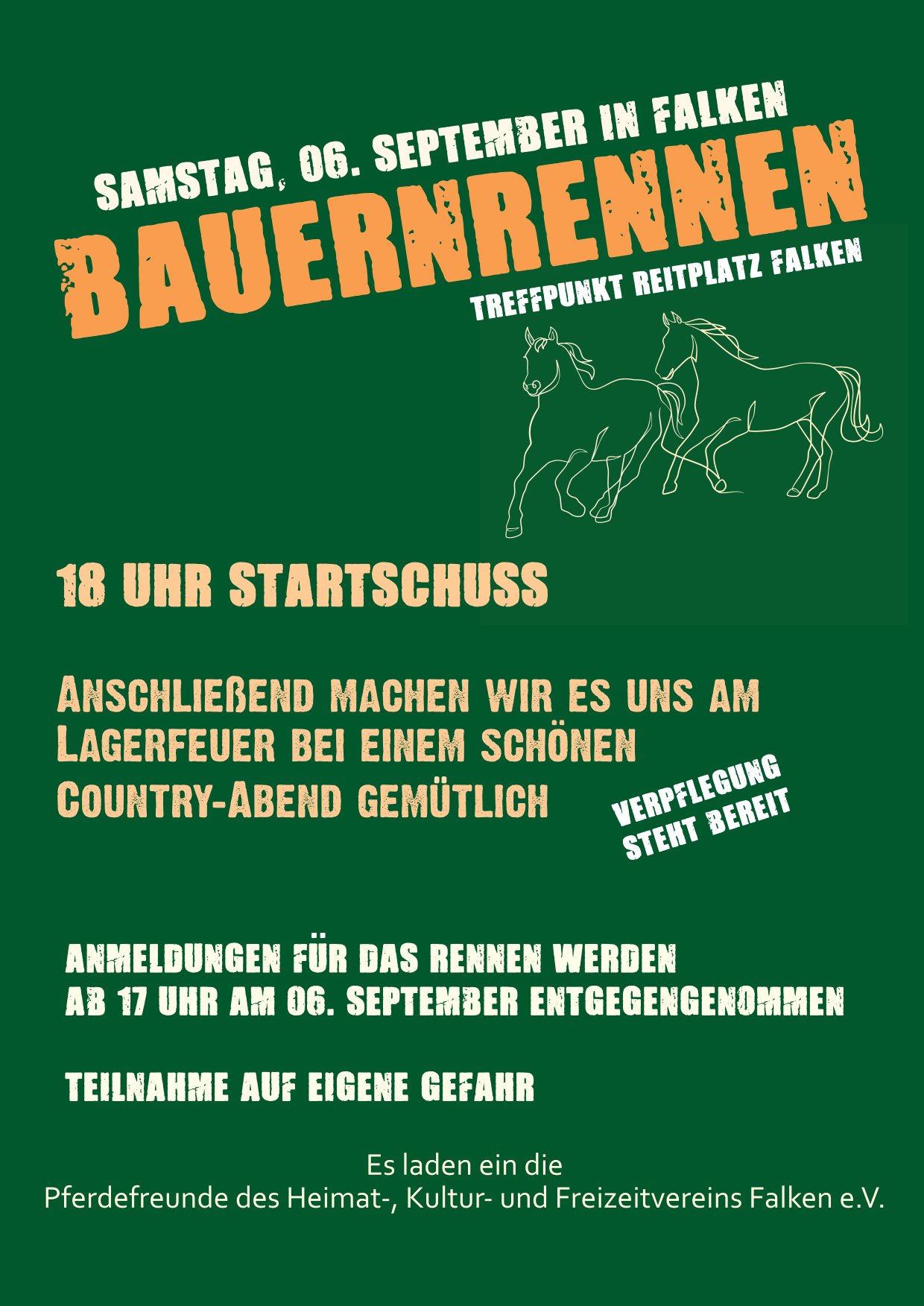 Die Pferdefreunde des Heimat-, Kultur- und Freizeitvereins Falken e.V. laden ein zum Bauernrennen. Anschließend gibt es einen gemütlichen Country-Abend mit Lagerfeuer. Für Verpflegung ist gesorgt.