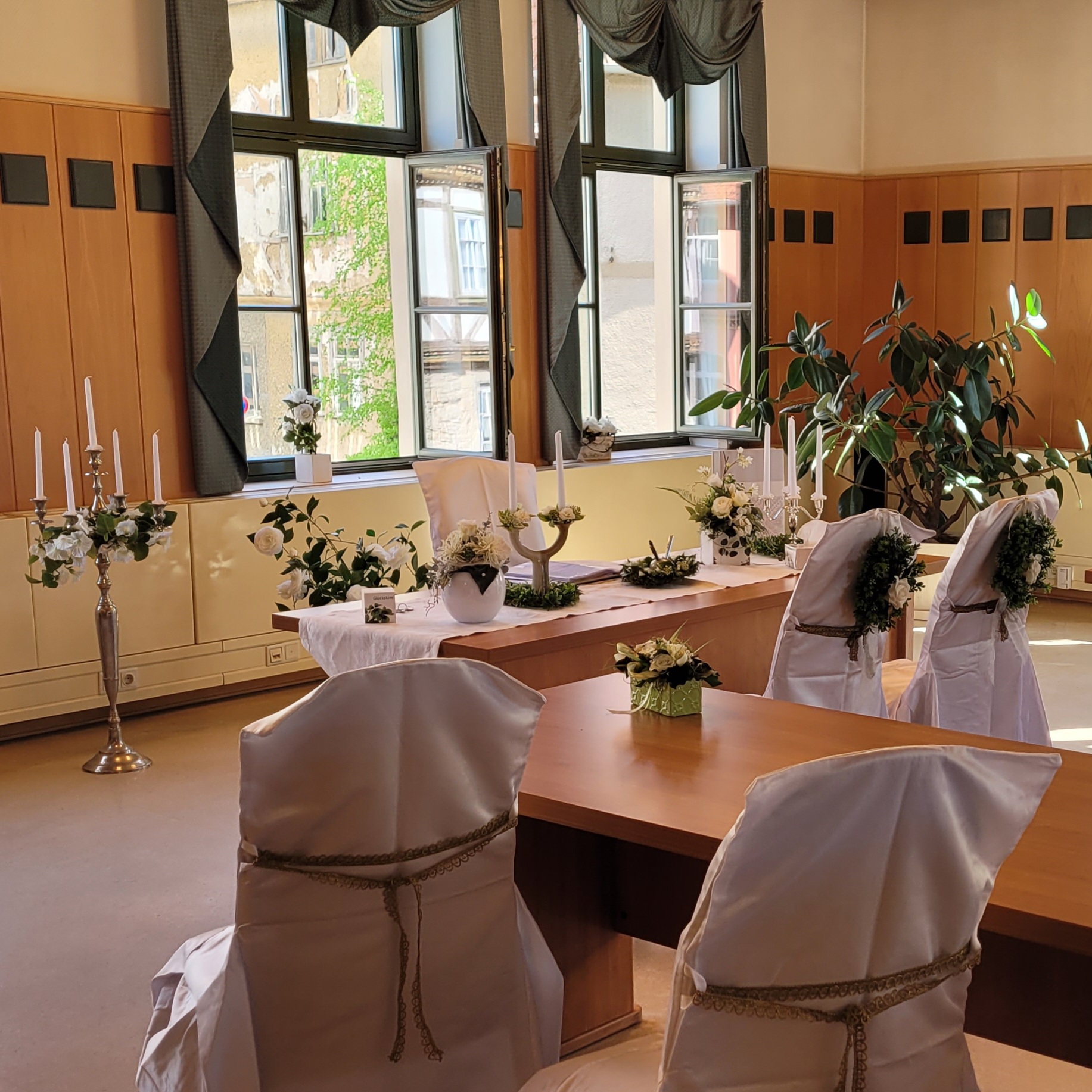 Ganzjährig sind Trauungen im Bürgerhaus der Stadt Treffurt möglich. Hierfür bietet der romantisch dekorierte und barrierefrei erreichbare Ratssaal/Trausaal das passende Ambiente für Ihre Hochzeit. Der Saal wird von drei Seiten mit Tageslicht durchflutet und bietet durch die Nutzung von mehreren Lichtstrahlern und Kronleuchtern genügend Spielraum für den ganz großen Auftritt. Es stehen 80 Sitzplätze zur Verfügung.