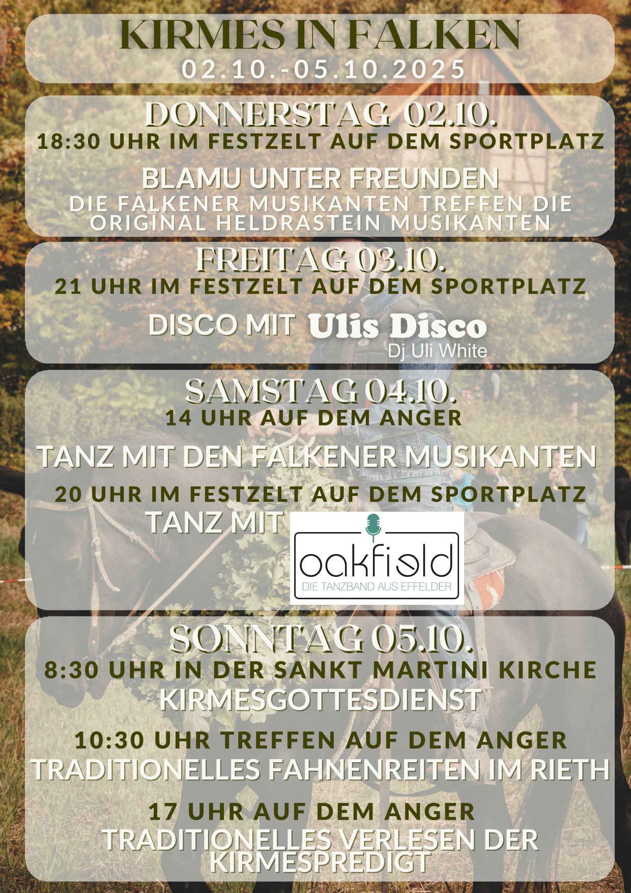 Traditionell startet der Sonntag in aller Frühe: Um 8:30 Uhr beginnt der Kirmesgottesdienst in der Sankt Martini Kirche zu Falken. Im Anschluss treffen wir uns um 10:30 Uhr am Anger, um gemeinsam zum wohl spannendsten Teil der Kirmes zu gehen: dem Fahnenreiten im Rieth. Ab 11:00 Uhr entscheidet sich dort, wer neuer Siegesreiter sein wird. Den Abschluss unseres Kirmeswochenendes bildet das Verlesen der Kirmespredigt. Ab 17 Uhr werden auf dem Anger Geschichten und Anekdoten aus dem vergangenen Jahr verlesen – ein geselliger Ausklang unserer Kirmestage.