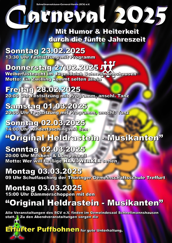 Unter dem Motto "Mit Humor und Heiterkeit durch die fünfte Jahreszeit" lädt der Schnellmannshäuser Carneval Verein zu seinen Veranstaltungen 2025 ein.